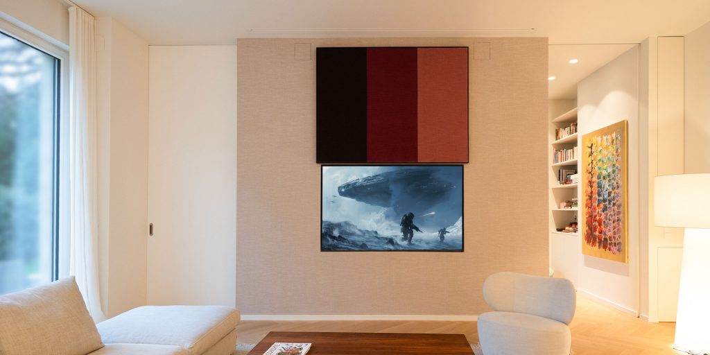 Ein großes TV-Gerät wird hinter einem Kunstwerk versteckt, das motorisiert verfährt  und den Raum ganz ohne Technik erscheinen lässt.