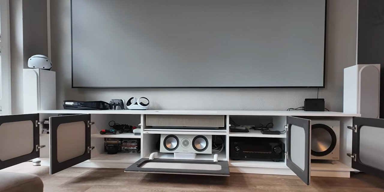 – Laser-TV im maßgefertigten Lowboard, – 5.1.4-Surround-System mit 3D-Sound.