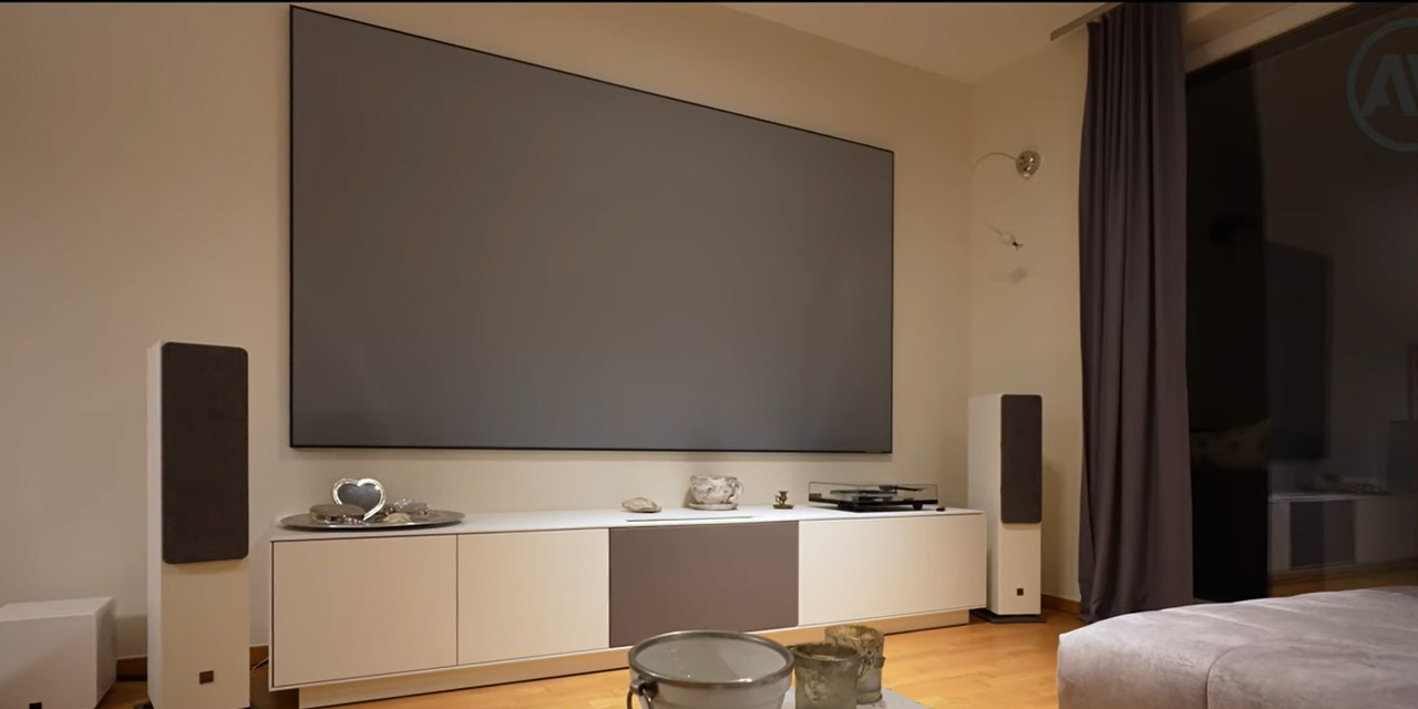 In diesem Video präsentiert das AVITECT Studio Rhein-Main ein Wohnraumkino mit vielen coolen Detaillösungen. Am auffälligsten ist das maßgeschneiderte Laser-TV-Board, in dem neben der gesamten Technik auch ein Center-Lautsprecher und der Laser-TV Platz finden. Bei dem Laser-TV handelt es sich um ein ganz besonderes Gerät: den LG Vivo Max. Er projiziert durch eine Öffnung in der Deckelplatte des Boards auf eine 120 Zoll große CLR-Leinwand, die auch bei Tageslicht eine hervorragende Performance liefert. Eine Besonderheit des Kinos ist das aktive Soundsystem von DALI. Die aktiven Lautsprecher liefern nicht nur eine optimale Performance, sondern können auch über Funk angesteuert werden. Somit ist es möglich, ein Surround-System ohne lästiges und oft unschönes Kabelverlegen zu realisieren. Damit es auch untenrum richtig schön viel Bass gibt, sorgt der kleine, aber äußerst leistungsstarke SVS SB-3000 Micro für knackige Impulse und spürbares Kino-Feeling.